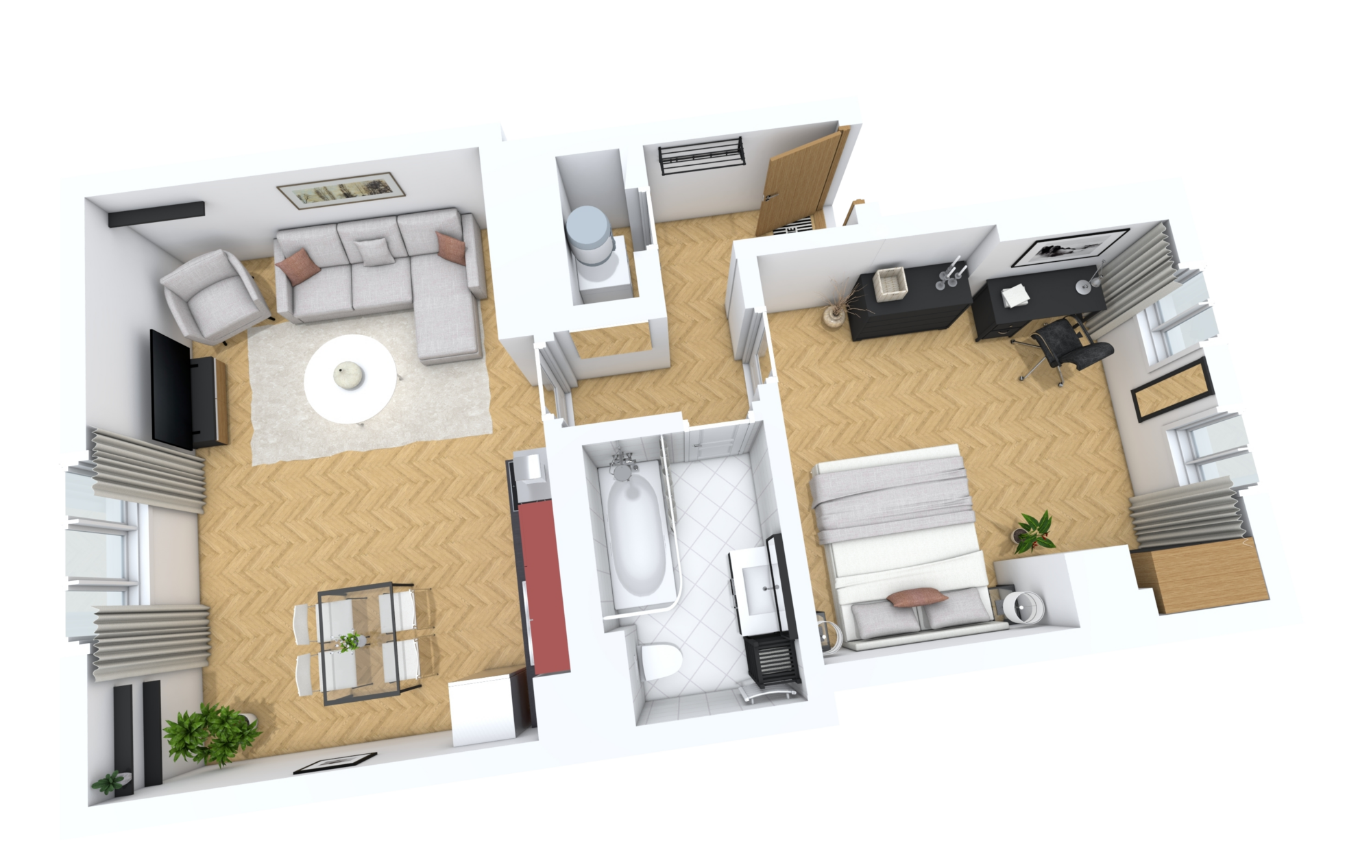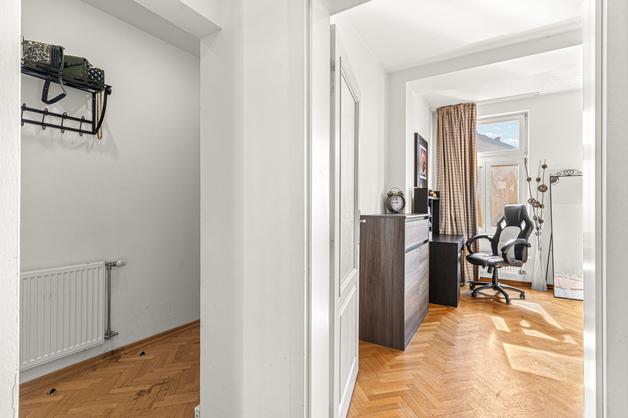 Byt se skládá z obývacího pokoje s kuchyňskou linkou, ložnice, vstupní chodby s komorou a koupelnou s vanou. Obývací pokoj je orientován Severozápadně do ulice Jana Masaryka a ložnice do klidného vnitrobloku na Jihovýchod.