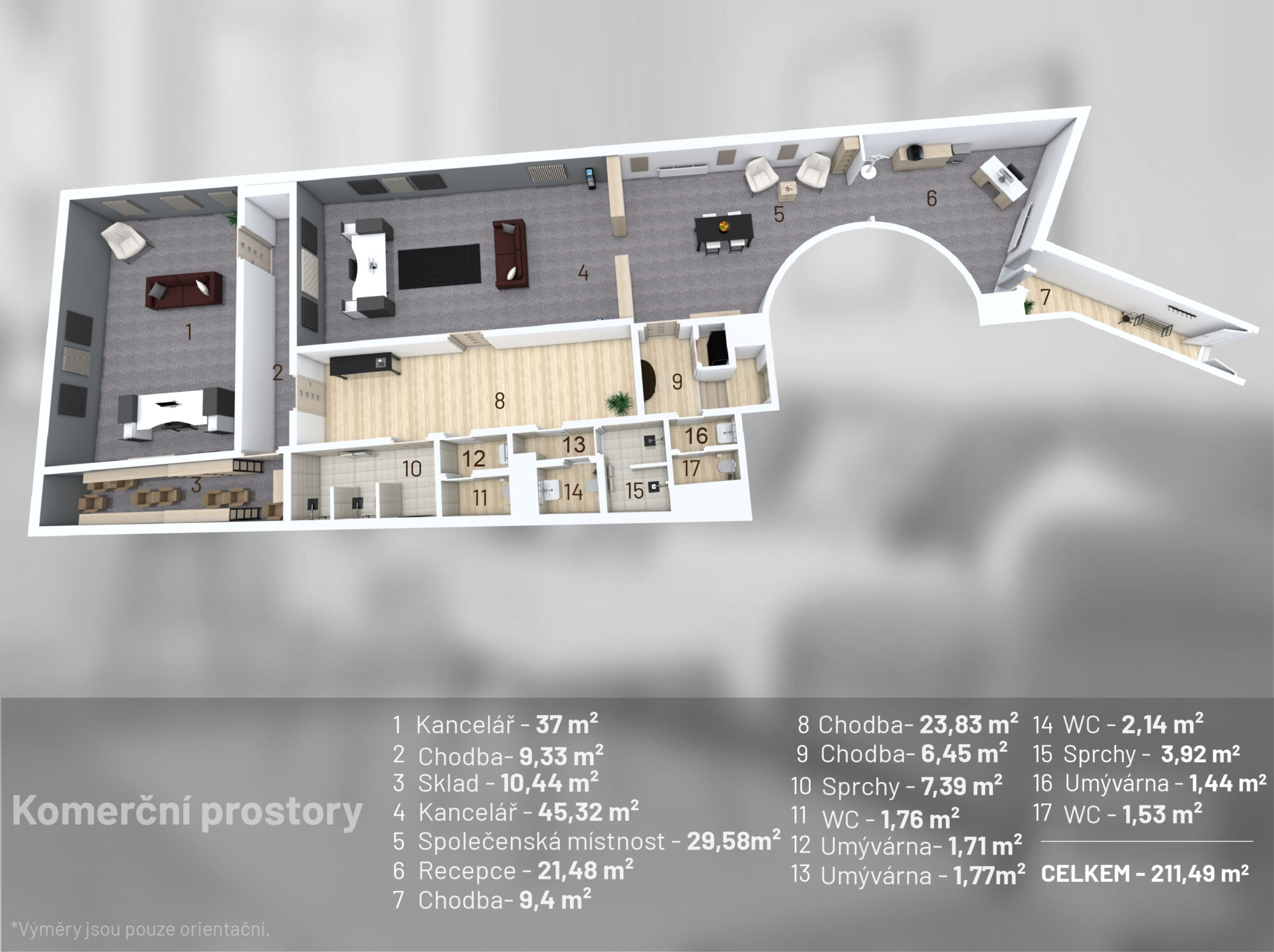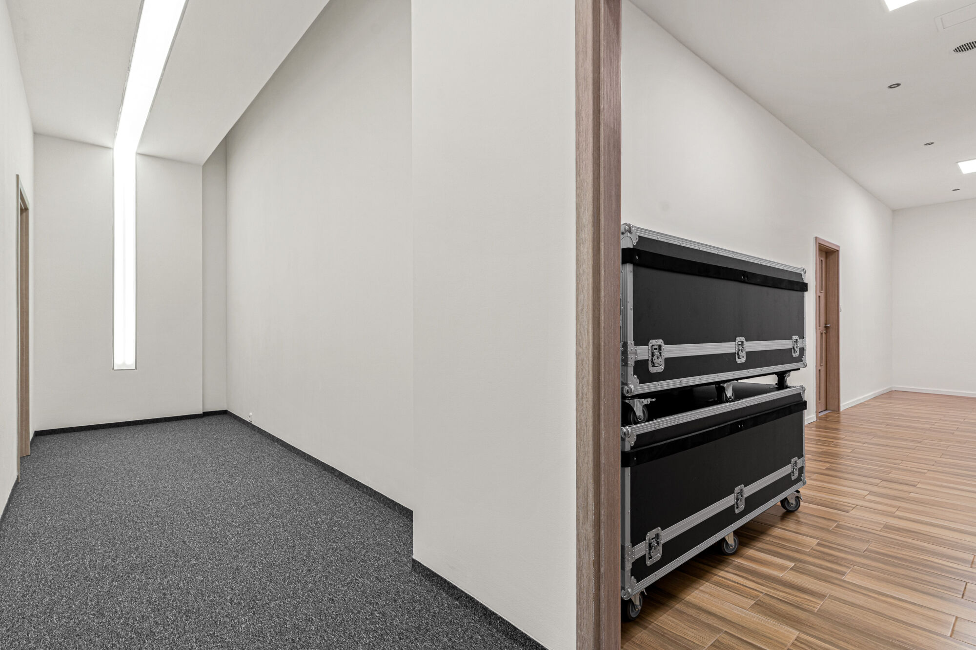 Interiér je nadstandardní: kamenné obklady, plnohodnotné sociální zázemí, sklad a technologické instalace odpovídající specifickým nárokům provozu. Konstrukční systém tvoří železobetonový skelet se zděnými příčkami a ústředním vytápěním, což zajišťuje stavební stabilitu a předvídatelné provozní náklady. Dispozice zahrnuje reprezentativní recepci, hlavní showroomy, sklady a oddělené zázemí.